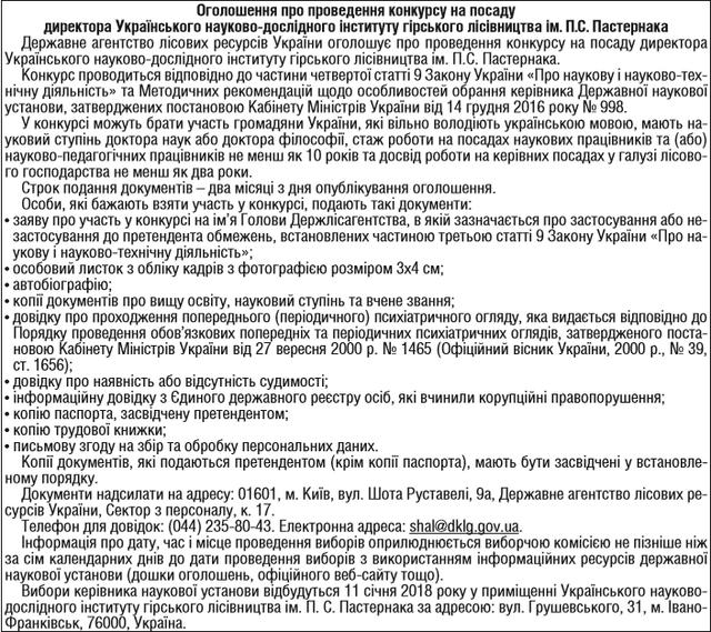 Державне агентство лісових ресурсів України оголошує про проведення конкурсу на посаду директора Українського науково-дослідного інституту гірського лісівництва ім. П.С. Пастернака.
